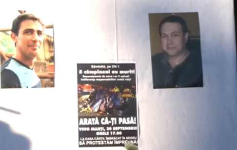 Protestatarii afişează pancarte şi mesaje în memoria celor cinci morţi nevinovaţi, originari din Câmpina, şi protestează la adresa autorităţilor.