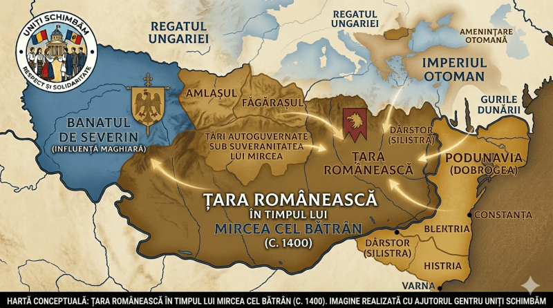 Hartă conceptuală a Țării Românești în jurul anului 1400, în timpul lui Mircea cel Bătrân, ilustrând unificarea cu Amlașul, Făgărașul și Dobrogea. Stil grafic Uniți Schimbăm. Include logo.