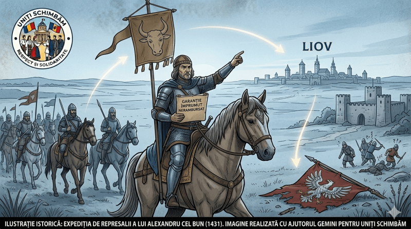 Ilustrație istorică a expediției militare a lui Alexandru cel Bun spre Liov în 1431, prădând ținutul și cucerind Pocuția ca represalii pentru trădarea Poloniei. Scenă dinamică, subliniind pedeapsa și hotărârea. Stil vizual Uniți Schimbăm. Include logo.