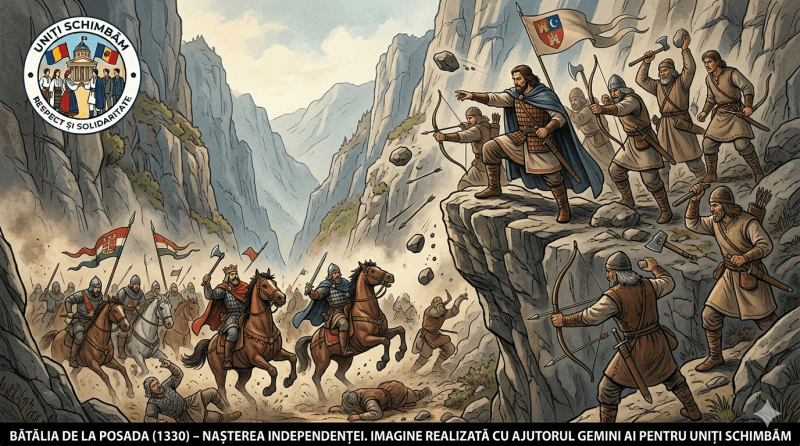 Ilustrație istorică a Bătăliei de la Posada (1330). Oștenii lui Basarab I atacă din ambuscadă, de pe crestele muntoase, armata maghiară a lui Carol Robert de Anjou prinsă în defileu. Scenă dinamică, dramatică, subliniind victoria noului stat. Include logo Uniți Schimbăm.