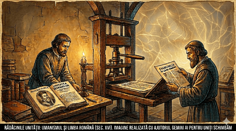 Ilustrație a diaconului Coresi la tiparniță, simbolizând nașterea limbii literare române ca prim pas spre unitate etno-lingvistică. Stil grafic Uniți Schimbăm. Include logo.