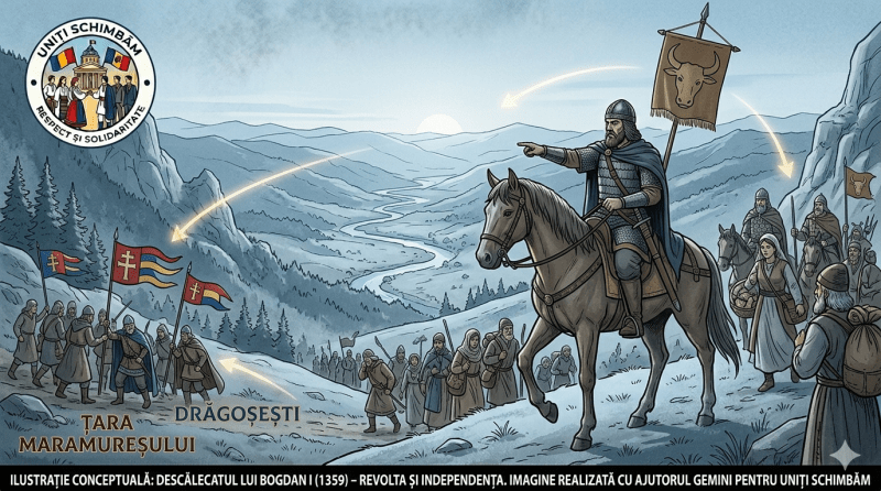 Ilustrație conceptuală a descălecatului lui Bogdan I din Maramureș în Moldova (1359), marcând revolta împotriva suveranității maghiare și începutul independenței noului stat. Stil vizual Uniți Schimbăm. Include logo.