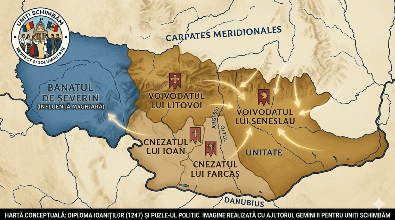 Hartă conceptuală a formațiunilor politice românești dintre Carpați și Dunăre menționate în Diploma Cavalerilor Ioaniți (1247): Banatul de Severin, cnezatele lui Ioan și Farcaș, voievodatele lui Litovoi și Seneslau. Stil grafic Uniți Schimbăm, pe fundal de pergament. Include logo.