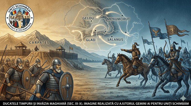 Ilustrație conceptuală a ciocnirii dintre nucleele statale medievale românești și cavaleria maghiară. O linie de luptători (vlahi/români), similari celor din imaginea obștii dar înarmați cu sulițe și scuturi simple, apără o fortificație timpurie de pământ și lemn în fața sarjei maghiare. O hartă conceptuală luminoasă suprapusă arată limitele celor patru ducate. În colțul din stânga-sus, logo-ul complet Uniți Schimbăm.