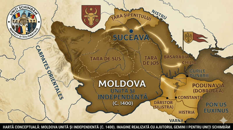 Hartă conceptuală a Moldovei unificate în jurul anului 1400, sub Roman I, arătând extinderea până la Nistru și Marea Neagră, inclusiv Țara de Sus, Țara de Jos și Țara Șipenițului. Stil vizual Uniți Schimbăm. Include logo.