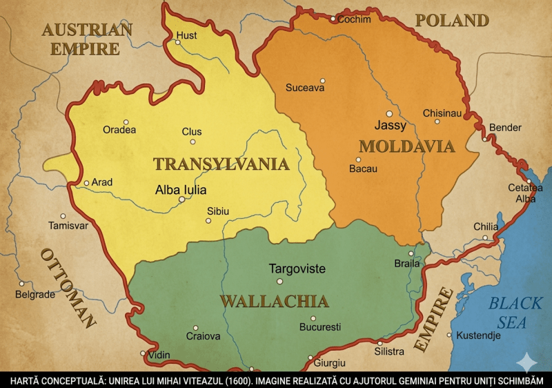 Hartă conceptuală a primei uniri politice a celor trei țări române sub Mihai Viteazul la 1600, ilustrând unificarea administrativă și stema comună. Stil grafic Uniți Schimbăm. Include logo.