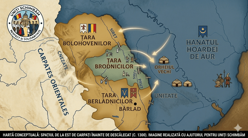 Hartă conceptuală a fragmentării politice de la est de Carpați în jurul anului 1300, ilustrând țările locale (bolohovenilor, brodnicilor, berladnicilor) și sfera de influență a Hanatului Hoardei de Aur. Stil vizual Uniți Schimbăm. Include logo.