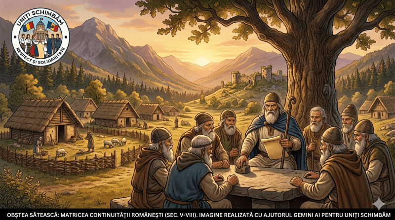 Ilustrație conceptuală a unei obști sătești timpurii într-o vale carpatică la apus. Un grup de bătrâni înțelepți (moși), purtând elemente de port tradițional dacic/roman, sunt adunați în jurul unui Jude (Judex) care ține în mână toposul de judecată. Atmosfera sugerează continuitate, pace și rezistență prin comunitate. În colțul din stânga-sus, logo-ul complet Uniți Schimbăm.