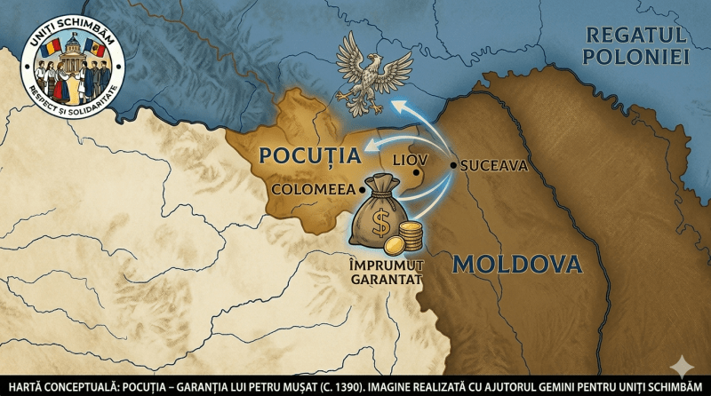 Hartă conceptuală a provinciei Pocuția în jurul anului 1390, ilustrând statutul său de garanție financiară pentru împrumutul acordat Poloniei de Petru Mușat, domnitorul Moldovei. Include localitățile cheie Colomeea, Liov și Suceava. Stil vizual Uniți Schimbăm. Include logo.