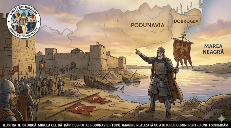 lustrație istorică a lui Mircea cel Bătrân la Dârstor (Silistra) în 1389, proclamându-se despot al Podunaviei după alungarea otomanilor. Stil grafic Uniți Schimbăm. Include logo.