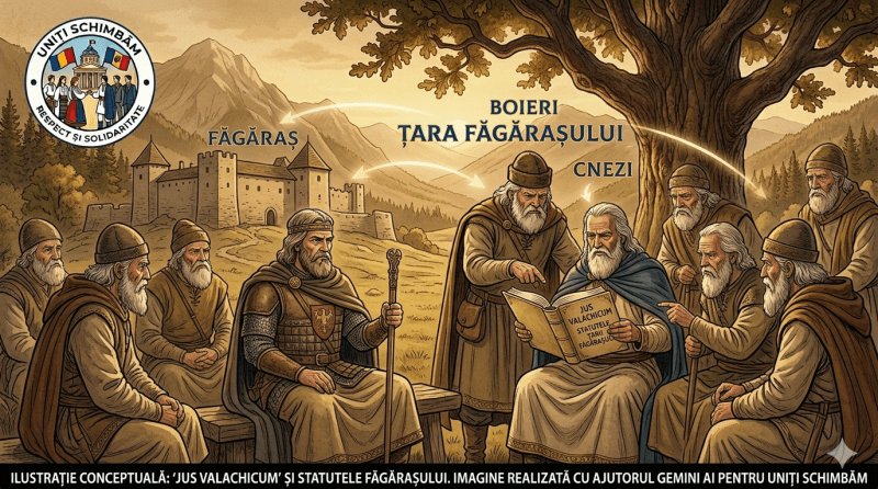 Ilustrație conceptuală a confirmării 'Jus Valachicum' și a Statutelor Țării Făgărașului de către Mircea cel Bătrân și boierii locali. Stil grafic Uniți Schimbăm. Include logo.